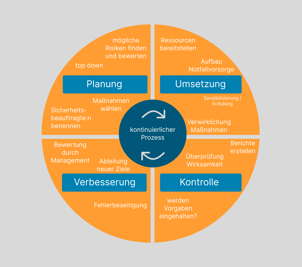 Einen Hackerangriff zu verhindern, ist ein kontinuierlicher Prozess, der sich lohnt. Die folgende Grafik zeigt das Vorgehen nach den BSI-Grundschutz Standards.